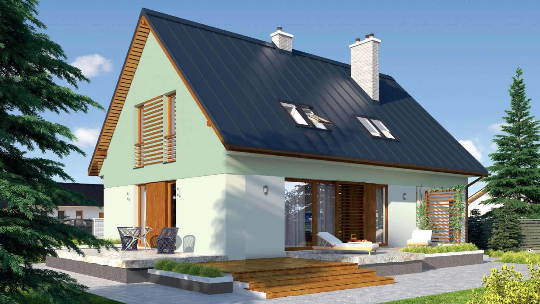Kolor niebieski jest niezwykle wyrazisty i może zbyt mocno wyróżniać się na tle sąsiadującej zabudowy, dlatego przede wszystkim poleca się stosowanie niebieskich farb fasadowych w jasnych odcieniach. Błękitny dom będzie budził pozytywne emocje oraz skojarzenia, przywodząc na myśl niebo, morze, szafiry, czy urokliwą architekturę Grecji. Błękitna elewacja sprawi, że dom nabierze lekkości oraz eterycznego charakteru. Błękitna farba fasadowa doskonale prezentuje się w połączeniu z bielą, szarościami, nieco ciemniejszymi odcieniami niebieskiego oraz grafitowym dachem.